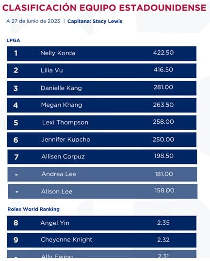 Sin embargo, no ha sido así en la clasificación del LPGA, que continúa teniendo a Nelly Korda en primera posición, con seis puntos más que Lilia Vu, en segunda posición.