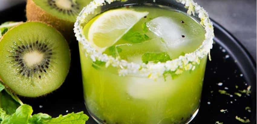 - Cortar un kiwi , colocarlo en la coctelera y agregarle el jarabe y zumo de limón. Macerar.