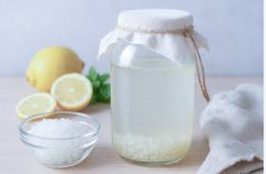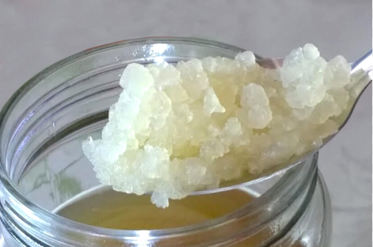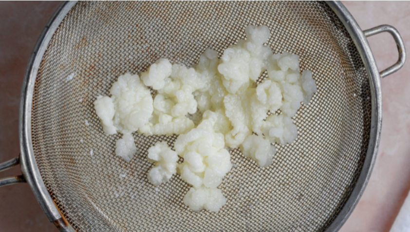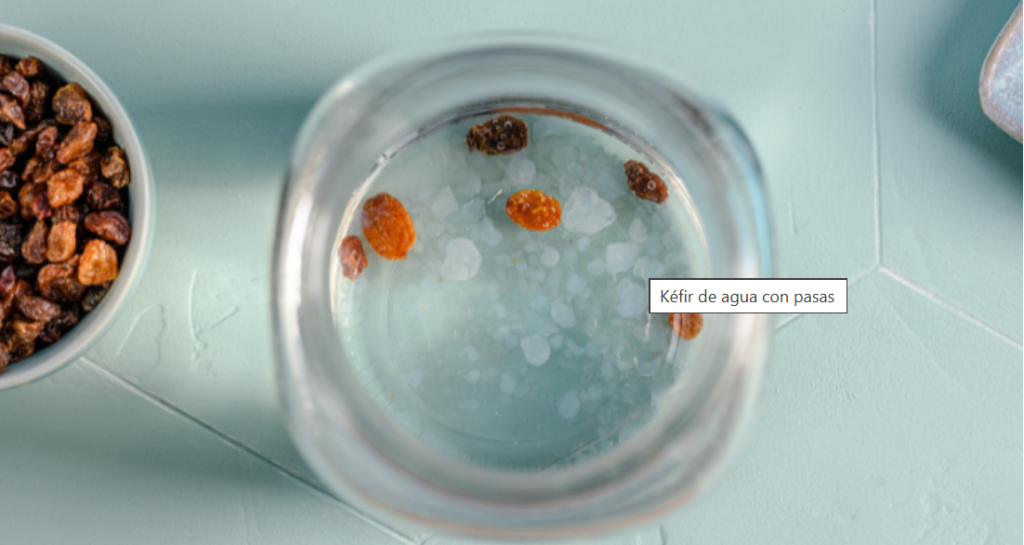 - En un frasco de vidrio, disuelve el azúcar en el agua y añade los granos de kéfir.