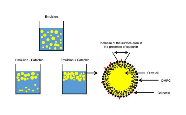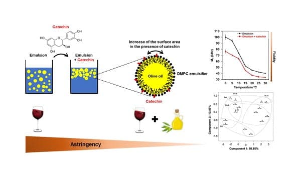El estudio, publicado en Journal of Agricultural and Food Chemistry, analizó las interacciones entre taninos y lípidos mediante resonancia magnética nuclear y microscopía óptica-electrónica. El resultado, reveló una interacción entre la catequina, un componente mayoritario de los taninos de uva, y gotas lipídicas de una emulsión de aceite en agua estabilizada por fosfolípidos. El tanino en la capa de emulsionante que rodeaba las partículas de aceite hizo que se formaran gotas más grandes, persistentes y reactivas.