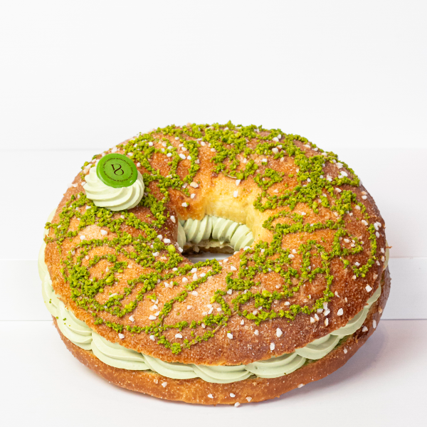 - Roscón de pistacho, con cobertura de chocolate blanco y relleno de pistacho y tarta de queso