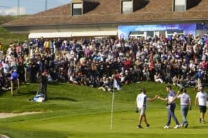 Al mismo tiempo llegó Jon Rahm al hoyo 18, abarrotado de público, donde rubricó su consabido birdie. Y con ello llegó también la locura colectiva, el cerrado aplauso de agradecimiento, la encendida ovación de reconocimiento, el punto y final a un Open de España 2018 absolutamente mágico.