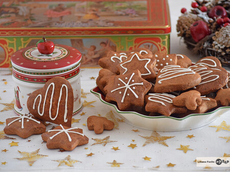 | MielAzúcar morenoAguaHarinaCanelaClavo, jengibre y nuez moscadaBicarbonatoHuevoLecheOpcional: glaseado de azúcar glas o chocolate | Calienta la miel, el azúcar y el agua hasta integrarlos y deja templar.Tamiza la harina con la canela, las especias y el bicarbonato.Agrega la mezcla templada y combina bien.Incorpora el huevo y la leche hasta formar una masa uniforme.Deja reposar la masa en la nevera durante varias horas para que se concentren los aromas.Estira la masa, corta en formas redondas, de corazón o estrellas.Hornea hasta que las galletas estén doradas y termina con glaseado o chocolate si lo deseas. |